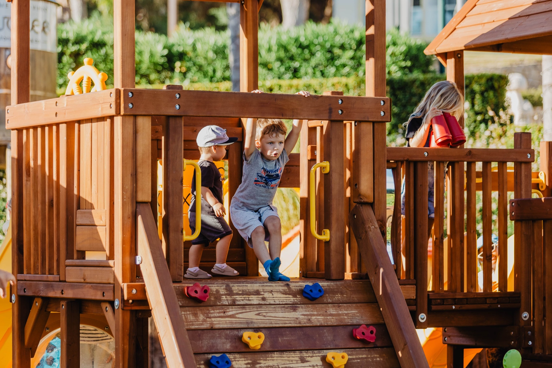The tower is accessible via a climbing wall and has two slides to guide them down to the ground to start all over again!